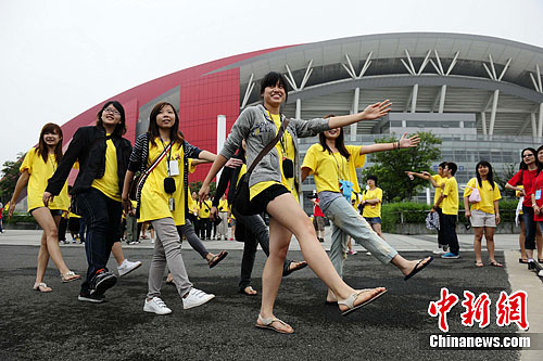 7月16日上午,“两岸同心,我们同行”2011年台湾青少年夏令营一行参观南京奥林匹克体育中心,一些女生在奥体中心前上演一场“美腿秀”。中新社发 侯宇 摄