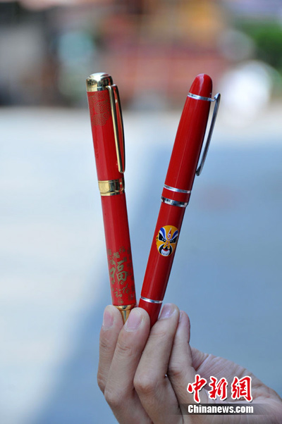 在江西省景德镇,一种以陶瓷以原料制成的办公笔近日受到职场女性的青睐,成为职场时尚新宠。陶瓷笔设计者周铭玉选择山水青花、京剧脸谱等作为设计元素,设计出颇具民族风的陶瓷笔作品。石卫明 摄