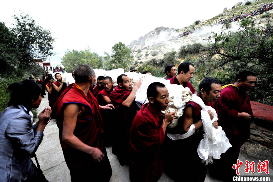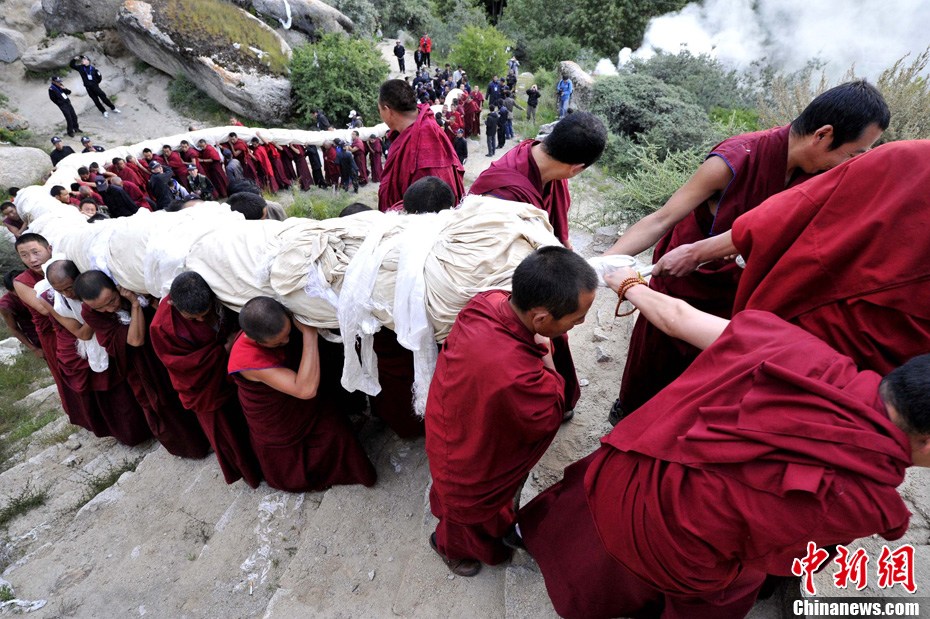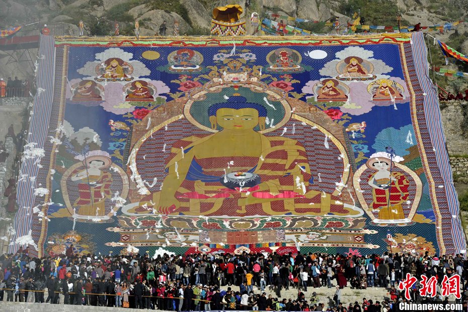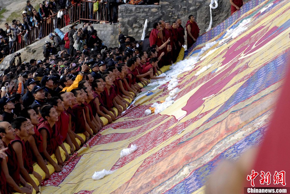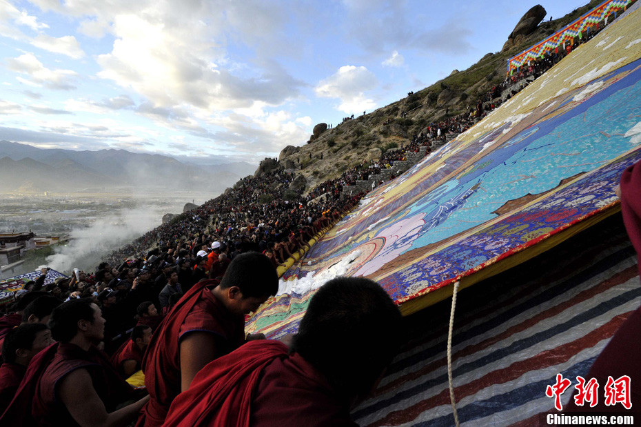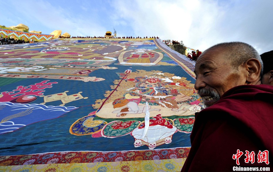 8月29日清晨,西藏拉萨哲蚌寺举行盛大的展佛活动(即展示巨幅释迦牟尼佛像唐卡),拉萨一年一度的雪顿节正式拉开帷幕。 雪顿节意为“吃酸奶的日子”,中国拉萨雪顿节2006年被列入中国首批非物质文化遗产保护名录。今年的雪顿节于8月29日至9月4日举行,主题为“幸福拉萨、多彩雪顿”。雪顿节期间,将有精彩的文艺汇演、体育竞技及经贸洽谈、旅游休闲等活动举行。图为哲蚌寺的僧人与巨幅唐卡。中新社发 李林 摄