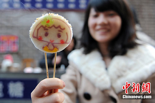 参与互动(0)2月17日,在西安市鼓楼附近的一家镜糕小摊上,机器猫、樱桃小丸子、蜡笔小新等各种“萌版”八宝镜糕吸引了过往游客的眼球。该小吃历史悠久,是以糯米为原料蒸制而成的形状似圆镜的糕。经营镜糕者多系摊担叫卖。清朝有诗云:“柳荫槐下清昼长,镜糕担子亦生香”。中新社发 张远 摄