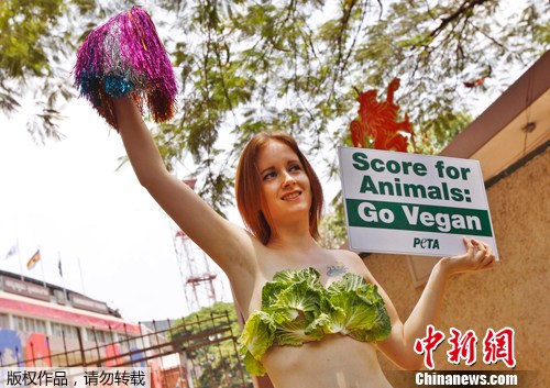 参与互动(0) 当地时间2012年4月9日,印度班加罗尔,善待动物组织(PETA)成员手持举牌“为了动物 成为素食主义者”,他们身着“生菜”,呼吁人们保护动物。