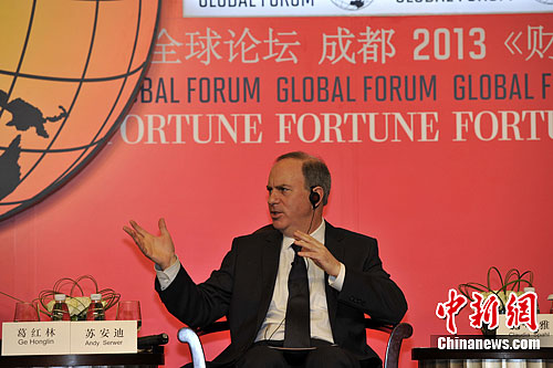 参与互动(0) 4月10日上午,《财富》杂志在成都举行媒体见面会。图为《财富》全球总编辑苏安迪发表演说。中新社发 安源 摄
