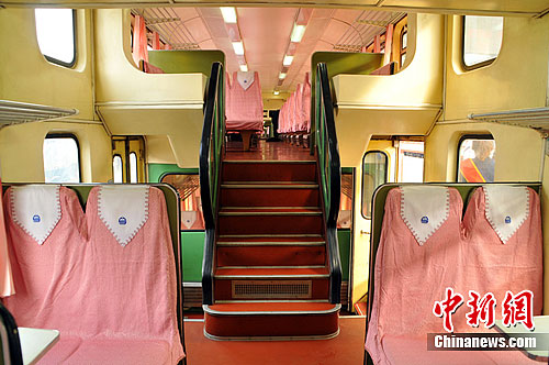 参与互动(0) 4月10日,新疆北疆的乌鲁木齐到南疆的阿克苏加开了新型双层空调快速列车,这趟车适宜公务、商务、旅游休闲旅客乘坐,有软卧、硬卧、硬座供旅客选择,票价最低为143元,最高为400元。该列车为新型双层空调快速列车,车内卫生整洁,并提供多种旅行服务,列车由软卧、硬卧、硬座车、餐车组成。马新龙 摄