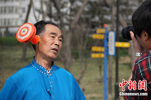 参与互动(0) 4月10日,在山西太原举行的空竹大赛上,年届八旬的郭存老人表演耳朵转空竹,引来现场民众的阵阵掌声。中新社发 韦亮 摄
