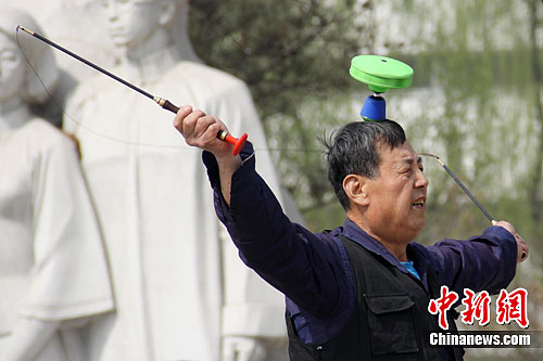 参与互动(0) 4月10日,在山西太原举行的空竹大赛侯考区,一名老年选手在行走的同时顶着转动的空竹,其高超的技艺令在场的民众称赞不已。中新社发 韦亮 摄
