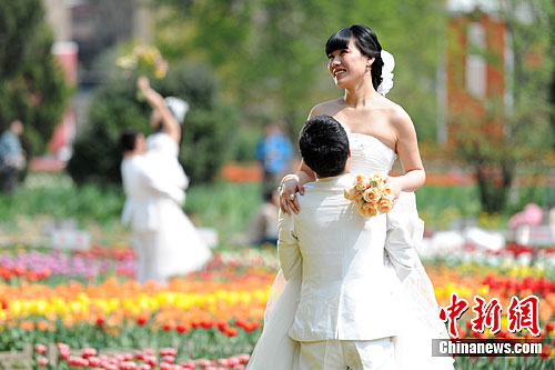 参与互动(0) 4月10日,随着春意渐浓、百花盛开,西安市民纷纷走出家门,于娇艳的绿地花海之中赏花踏青,亲近自然。而拍婚纱照的新人们亦是“三五成群”,随处可见。图为拍婚纱照的新人在春意中秀恩爱。张远 摄