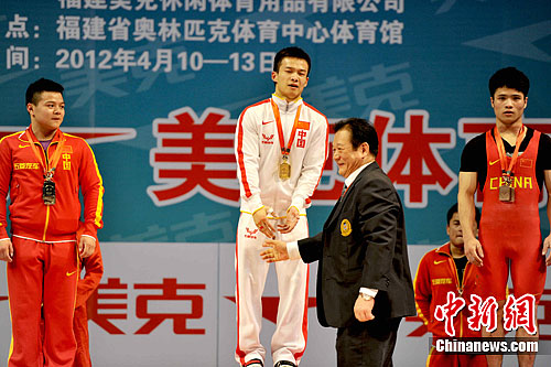 参与互动(0) 4月10日,由国家体育总局举办\福建省体育局承办的2012年全国男子举重锦标赛暨伦敦奥运会选拔赛在福州举行。解放军选手吴景彪以总成绩300公斤击败北京奥运会冠军龙清泉,夺得男子56公斤级别冠军。王东明 摄