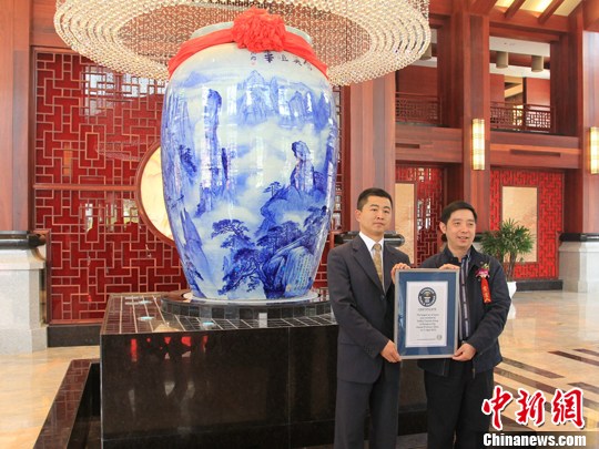 世界最大瓷瓶11日在世界自然遗产地三清山诞生。吉尼斯世界纪录认证官程东博士宣布,“三清圣境圆融瓷瓶以368升的容积,打破了目前339.9升的纪录,成为世界最大的瓷瓶。”