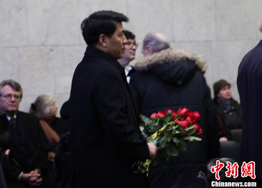 参与互动(0) 俄罗斯前驻华大使罗高寿遗体告别仪式11日在莫斯科中央临床医院举行,图为中国驻俄大使李辉出席葬礼并向逝者敬献鲜花。罗高寿遗体于当日午后在莫斯科特罗耶库洛夫公墓落葬。中新社发 贾靖峰 摄