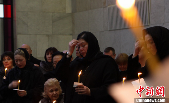 参与互动(0) 俄罗斯前驻华大使罗高寿遗体告别仪式11日在莫斯科中央临床医院举行,图为罗高寿夫人为丈夫祷告。罗高寿遗体于当日午后在莫斯科特罗耶库洛夫公墓落葬。中新社发 贾靖峰 摄