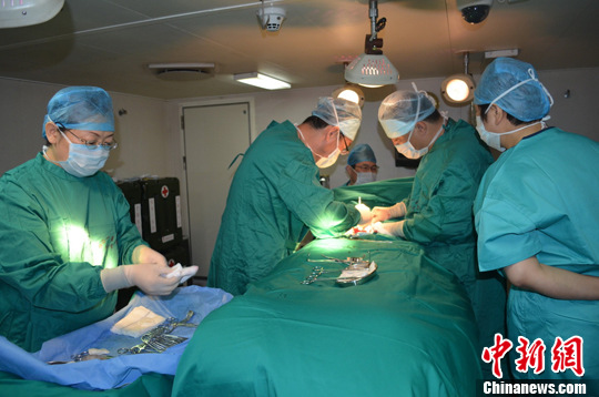 参与互动(0) 解放军401医院“专家医疗队”近日随第十一批护航编队赴亚丁湾索马里海域执行护航任务。图为海军第十一批护航编队医疗队在为病人进行手术治疗。中新社发 杨尚军 摄