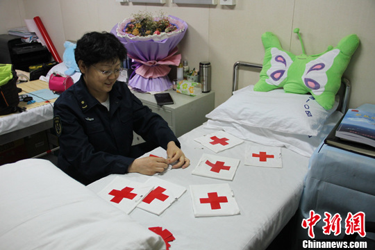 参与互动(0) 解放军401医院“专家医疗队”近日随第十一批护航编队赴亚丁湾索马里海域执行护航任务。图为海军第十一批护航编队医疗队队长郭俭在制作红十字袖标。中新社发 杨尚军 摄