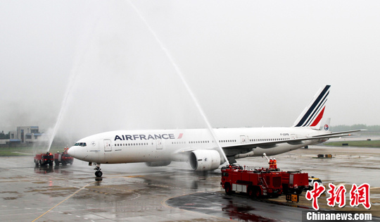 参与互动(0) 图为法航波音777-200ER型飞机降落武汉天河机场受到“接风洗尘”。中新社发 张畅 摄