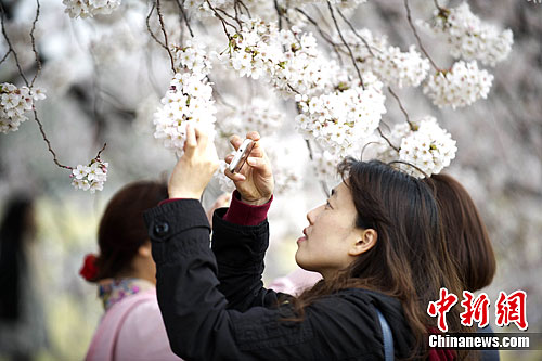 参与互动(0) 东京进入赏樱季,各处“花见”名所游人络绎不绝。因今年持续的低温,东京的樱花较往年迟开了五天。4月10日,东京市内的樱花已经满开。中新社发 孙冉 摄