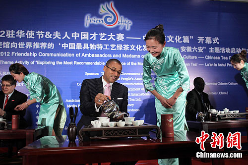 参与互动(0) 4月12日,牙买加驻华大使考特尼·拉特雷在北京学习茶艺。当日,“2012驻华使节&夫人中国才艺大赛——中国茶文化篇”开幕式在北京举行,来自69个国家的180多位驻华使节共同启动“寻访中国最具独特工艺绿茶文化发祥地——安徽六安”主题活动。中新社发 苏丹 摄