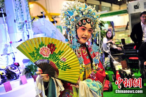 参与互动(0) 4月12日,一位学京剧的学生在北京展览馆的“第十四届中国国际花卉园艺展览会”上为观众演出《贵妃醉酒》中的精彩唱段。中新社发 邹宪 摄