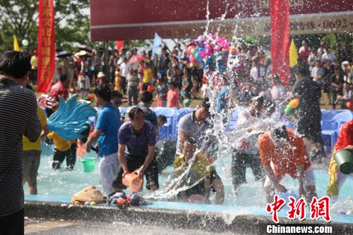 参与互动(0) 4月13日,“2012中国德宏瑞丽泼水节暨首届红木文化节”在云南省德宏州瑞丽市拉开帷幕。在云南全省遭遇三年连旱的背景下,今年泼水节期间“节水过节”成为共识。图为在指定区域内参与泼水的市民。中新社发 吴华丽 摄