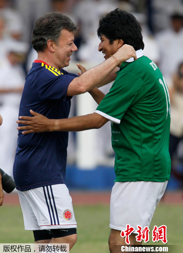 当地时间2012年4月13日,哥伦比亚Cartagena,玻利维亚总统莫拉莱斯和哥伦比亚总统桑托斯在美洲峰会召开前,参加足球对抗赛,大秀高超球技。