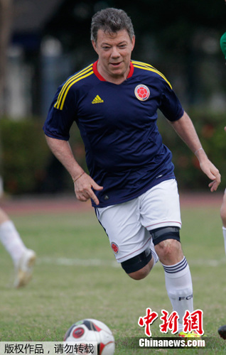 参与互动(0)图为哥伦比亚总统桑托斯带球。