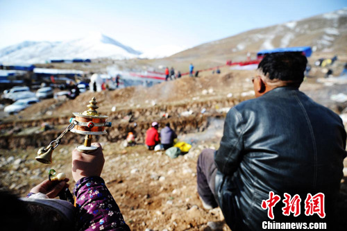 参与互动(0) 2012年4月14日,青海省玉树县民众走上结古镇东德隆钦山下的扎西大同天葬台,用煨桑、转经筒、献花等方式来祭奠逝去的亲人。两年前,玉树发生7.1级地震,造成两千多人遇难。杨艳敏 摄