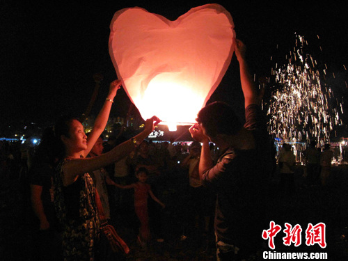 参与互动(0) 4月13日晚,云南省西双版纳州景洪市的澜沧江畔,数万名市民和游客举行祈愿仪式放飞孔明灯,打造“火树银花不夜天”的壮丽场面。据了解,傣家孔明灯代表了吉祥与祝福,总在每年泼水节的夜晚放飞夜空。图为一对情侣放飞心型孔明灯。中新社发 顾一航 摄