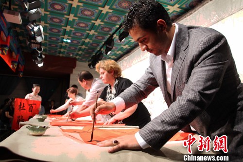 参与互动(0) 4月14日,驻华使节在北京比赛中国书法。当日,“2012驻华使节和夫人中国才艺大赛——民族文化篇”在北京老舍茶馆举行。中新社发 苏丹 摄