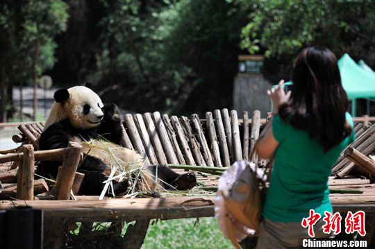 参与互动(0) 4月18日,思嘉在悠闲的啃竹子。汶川地震时,3只大熊猫思嘉、美茜、芊芊被送往云南野生动物园寄养,如今它们在园方的精心照料和市民的关怀下健康成长。中新社发 刘冉阳 摄