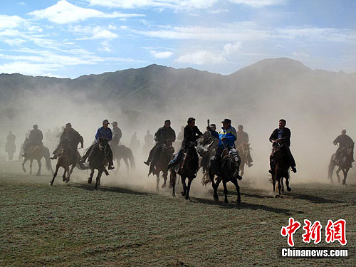 当地的哈萨克民众正在表演“叼羊”比赛。闫文陆 摄