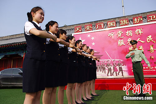 5月22日下午,北京铁路局京沪高铁上的“高姐”们来到了天安门北侧国旗班的驻地,请国旗班的战士们指导军姿。据悉,这种训练是为了更好地培养高姐们的仪态仪表,提高铁路服务质量。中新社发 贾天勇 摄