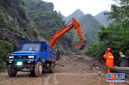 参与互动(0) 5月22日,黔江区国道319线滑坡地段,工作人员利用大型机械进行道路清理。王松 摄