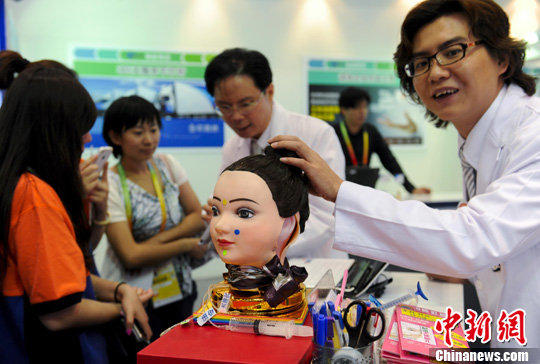 5月28日,第一届中国(北京)国际服务贸易交易会在北京开幕,台湾馆内的私人美容诊所展台吸引了众多女性的关注。中新社发 刘震 摄