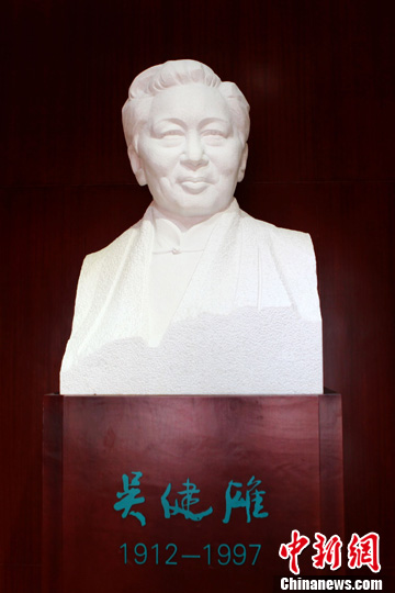 5月31日,吴健雄陈列馆在江苏太仓健雄职业技术学院内开馆。图为陈列馆一楼内雪白、高洁的吴健雄半身像石雕。中新社发 李克祥 摄