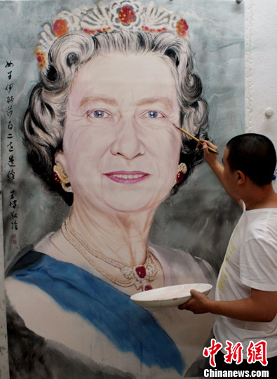 6月1日,四川青年画家王博为英国女王登基60周年,创作完成了一幅高2.47米,宽1.27米的伊丽莎白二世水墨肖像画。图为创作中的四川青年画家。中新社发 刘忠俊 摄