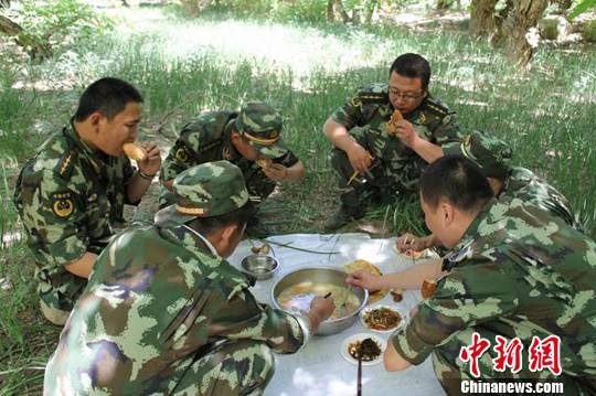 新疆边防老爷庙边检站5月31日组织开展“野外拉练强素质,戈壁生存砺精兵”处突科目训练,检验了部队远程增援处置突发事件和实战条件下后勤综合保障能力。张乐 摄