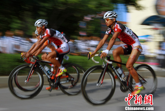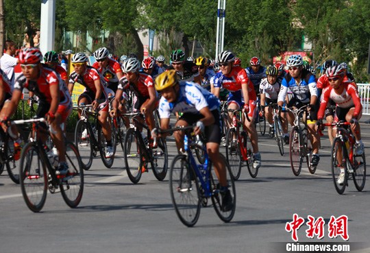 6月1日,新疆环赛里木湖公路自行车赛最后赛程——在新疆博乐市城区绕圈赛结束。图为新疆环赛里木湖公路自行车赛进入最后的赛程,绕博乐市城区绕行。