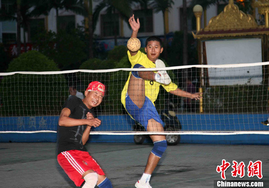 位于云南省瑞丽市姐告边境贸易区的国门社区广场是中缅边民最青睐的文体活动场所。每逢夜幕降临,广场上便热闹非常,而在缅甸最受欢迎的藤球也成为广场上最热闹的活动之一。中新社发 顾一航 摄