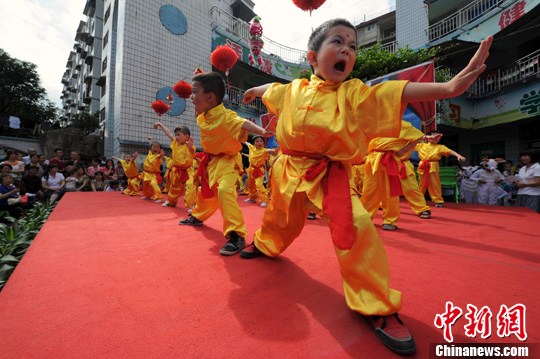 6月1日,福州一家幼儿园举办亲子活动,学龄前儿童在台上向参加活动的家长、老师汇报表演所学武术套路,庆祝国际儿童节。中新社发 郑祚声 摄
