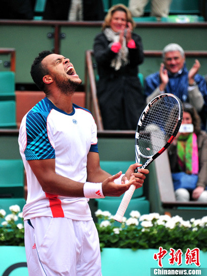 法网男单5号种子、本土宠儿特松加4日在男单第四轮中决胜盘最后的第十局完成制胜破发,最终以6-4,7-6(6),3-6,3-6,6-4力压瑞士名将瓦林卡,拿到了八强入场券。中新社发 龙剑武 摄