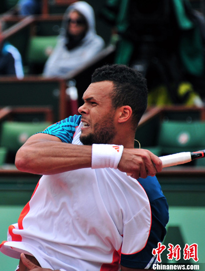 法网男单5号种子、本土宠儿特松加4日在男单第四轮中决胜盘最后的第十局完成制胜破发,最终以6-4,7-6(6),3-6,3-6,6-4力压瑞士名将瓦林卡,拿到了八强入场券。中新社发 龙剑武 摄
