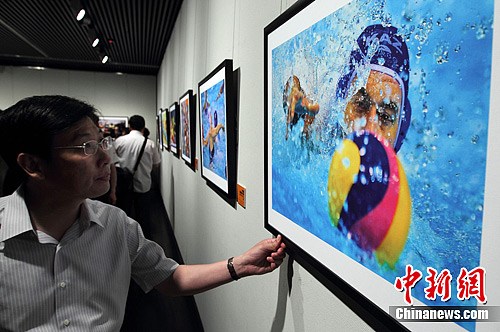 图为现场展出的精彩体育摄影作品吸引参观者的眼球。泱波 摄