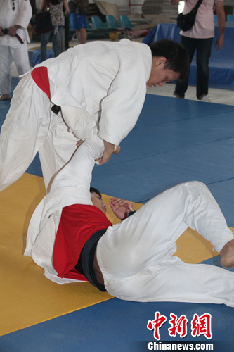 6月22日,高雄左营集训中心,中华台北柔道选手在捉对训练。中新社发 董会峰 摄