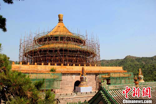 图为承德避暑山庄及周围寺庙文化遗产保护工程重要项目之一——承德“外八庙”中的普乐寺主体建筑“旭光阁”正在修缮中。张帆 摄