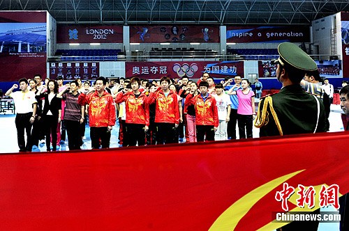 6月27日,伦敦奥运会国家女子乒乓球队新党员(前排左起)施之皓、丁宁、李晓霞和郭跃入党宣誓。当日,正在备战伦敦奥运会的国家乒乓球队新党员李晓霞、丁宁、郭跃、施之皓和四川省运动队新党员在位于成都的国家乒乓球队训练馆入党宣誓。中新社发 安源 摄
