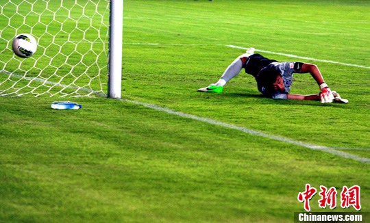 6月29日,在上海申鑫主场,辽宁门将宏运张鹭正在门前扑救。庄毅 摄