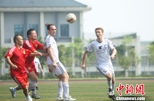 7月14日,为将奥运的热情与喜悦带入社区,英国驻重庆总领事馆在四川外国语学院足球场上特别举行一场“为奥运加油”社区足球国际友谊赛。本次比赛由协信社区联队对阵重庆国际足球俱乐部队。中新社发 陈超 摄