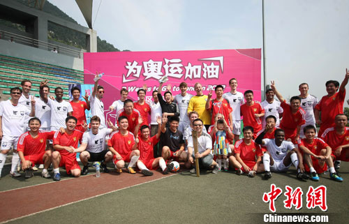 7月14日,为将奥运的热情与喜悦带入社区,英国驻重庆总领事馆在四川外国语学院足球场上特别举行一场“为奥运加油”社区足球国际友谊赛。本次比赛由协信社区联队对阵重庆国际足球俱乐部队。中新社发 陈超 摄