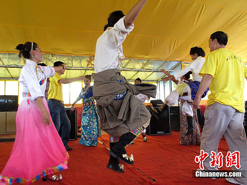 海外华裔青少年带队老师和学生一起与当地牧民跳起藏族舞蹈。张杰英 摄