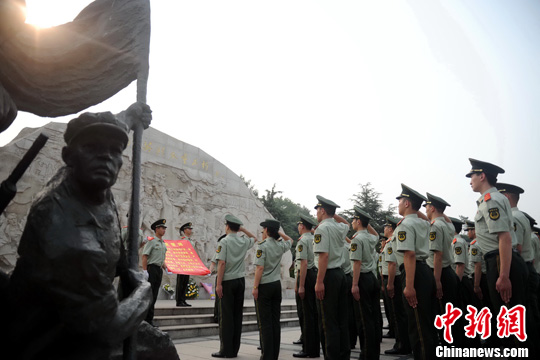 7月31日,“八一”建军来临之际,武警合肥市支队组织官兵,来到渡江战役纪念馆和合肥大蜀山烈士陵园,缅怀革命先辈的丰功伟绩。中新社发 王绪发 摄