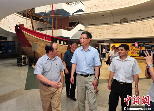 7月31日,国务院侨办副主任何亚非(左二)在广东省侨办主任吴锐成(左一)陪同下参观广东华侨博物馆。中新社发 柯小军 摄