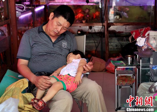 7月31日,夏日炎炎,在江苏南京城南街边的一处商店内,家长随着手中怀抱着的孩子一同慢慢入睡,人来人往也丝毫没有打扰到他们。中新社发 泱波 摄